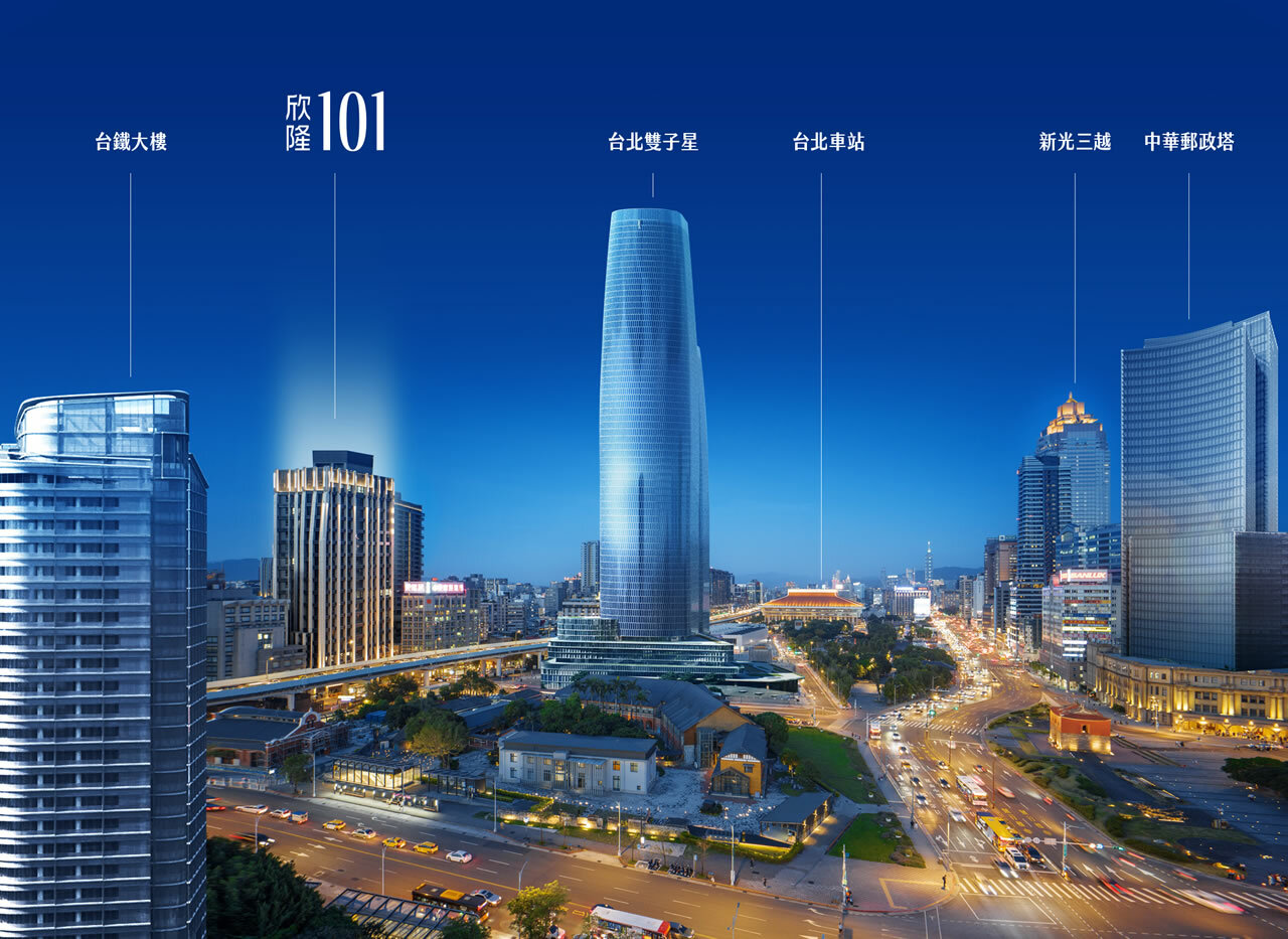 曾經榮耀一百年,未來輝煌一世紀。「欣隆101」正對台北雙子星,零距離接收台北西區門戶計劃,零時差連結台灣國門,世界全在你掌心。媲美紐約第五大道Artdeco時代,向上垂直新古典崗石外觀,新日鐵制震結構、獨立整層都會休閒會所,為國際旅人打造典藏級地標居所。